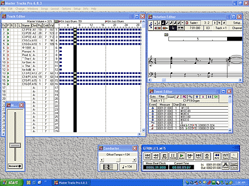 | Recording and Playback Features * 64 tracks with independent track looping. * Quickly audition and select sounds for virtually any MIDI synthesizer from Master Tracks Pro's editable Device list. List includes General MIDI, and several popular synthesizers. Customize existing lists or create your own. * Bank Select lets you switch to alternate banks of sounds in your MIDI instruments. * Assign any controller like volume, reverb, chorus, or pan to any recordable fader for an automated mix down. * Step Entry: Input notes in step time with selectable duration, velocity, articulation, and MIDI channel for each note. * Looping: Loop any number of tracks independently. * Automated Punch-in: Automatically enter and exit record mode at predetermined "punch" points while your sequence plays. * SMPTE support: Synchronize your music to film, video, or audiotape. * See an accurate display of your sequence's elapsed time, stored tempo, playback tempo, and current time signature. * Control playback and recording; select step-time note duration from your MIDI instrument. * Import, export, and explode Standard MIDI files: Type 0 or C type 1. * Big Counter is perfect for monitoring your sequence at a distance. * Multi-Port support allows for up to 256 MIDI channels. Editing Features * Hot Keys add key commands for transposition, quantize, editors, and more. * Velocity Window shows every note's velocity. * Graphic note editing: Click and drag with your mouse to change a note's pitch, duration, or timing. * Note Velocity Stems give you visual velocity editing. * Event List Editing: Accurately edit note, controller, and time data from an alphanumeric list. * Change Filter: Simple, one-step editing of notes by their location, duration, pitch, velocity, or channel. * Cut, Copy, and Paste editing: Insert or delete any selection to modify your music as easily as editing text with a word processor. * Individual Track Lock lets you transpose your song without affecting drum parts. * Change note duration, velocity, channel, tempo, or time signature globally or for a specific section. * Quantize and Humanize: Tighten up timing errors or loosen robotic, step-entered sequences. * Fit Time: Automatically adjust tempos to make any section fit a specified length of time. * Zoom in or out: See data in macro or micro views. * Graphic editing of MIDI controller data complete with ghost notes. * Snap to Grid allows you to quantize your step entry with a mouse. * Control the music's feel: Slide selected regions forward or backward in time. * Song Play List enables you to load and play a whole set list of songs for live performance. * Sync your music to SMPTE via MIDI Time Code with a MIDI/SMPTE interface. * Use the Event Editor window as a cue sheet. * Supports all SMPTE formats for video and film production. * Export files into Encore, MusicTime Deluxe, or MusicTime Online at NotationStation.net, to notate standard notation scores. * Save and load MIDI System Exclusive data (voices, drum machine data, etc.) with Pro's built-in Sysex librarian Windows-Only Features * Edit and print your music on a Grand Staff in the Notation Editor. * Record and play WAV audio directly using Window's MCI commands. * Trigger MCI media events during playback at any point within a sequence. Control multimedia devices or play WAV audio files. * Support of Windows 3.1 Multimedia Extensions: MIDI Mapper and MCI (Media Control Interface) commands Macintosh-Only Features * OMS Support for working with large MIDI systems. * Support for Quicktime 2.0 internal synthesizer. * Looped Overdub and Record for drum machine-style recording. * Machine control lets you control tape decks or other MIDI devices from Master Tracks Pro's transport |